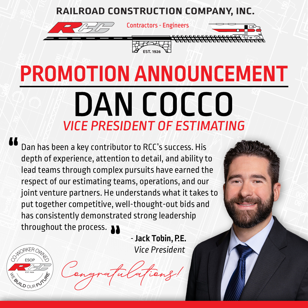 We are pleased to announce the promotion of Dan Cocco to Vice President of Estimating.