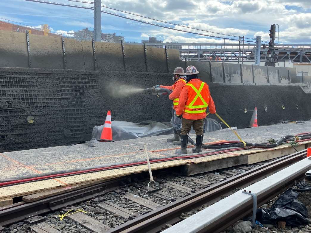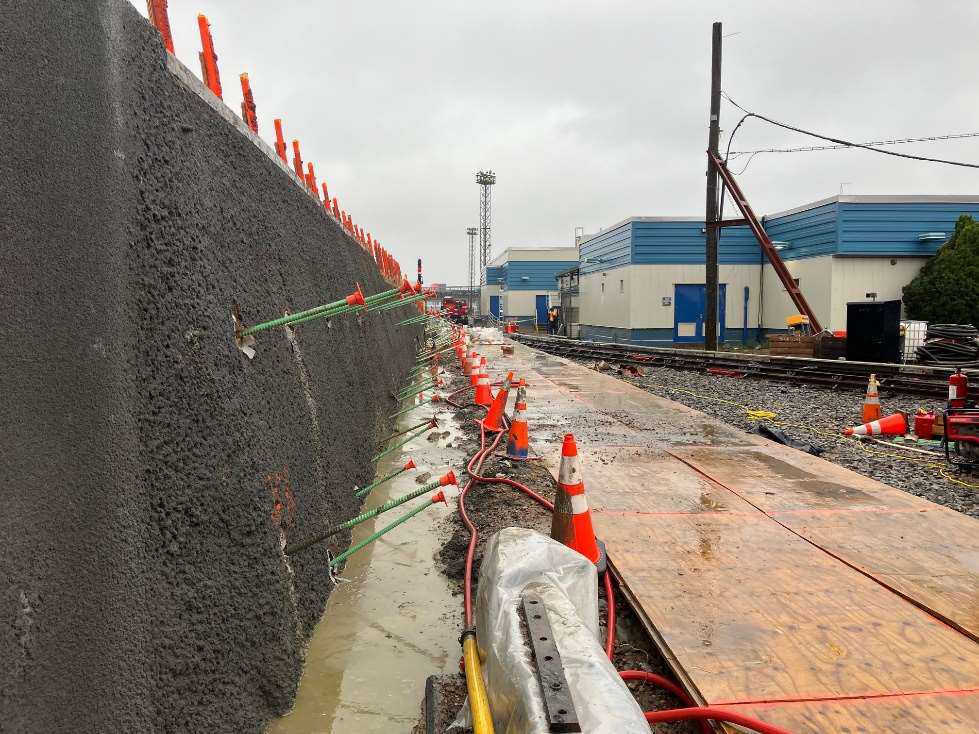 Coney Island Yard involved designing and constructing a new retaining wall system on the track-side fascia of the existing crib wall, including the removal of temporary wooden structural elements and deteriorated concrete. Structural components were reinforced and replaced. New bridge clips, wire baskets, and contact rail appurtenances were installed, and existing light fixtures along with associated conduits were replaced. The project also included maintaining and protecting existing signal equipment and traction power cables, as well as performing track alignment testing.